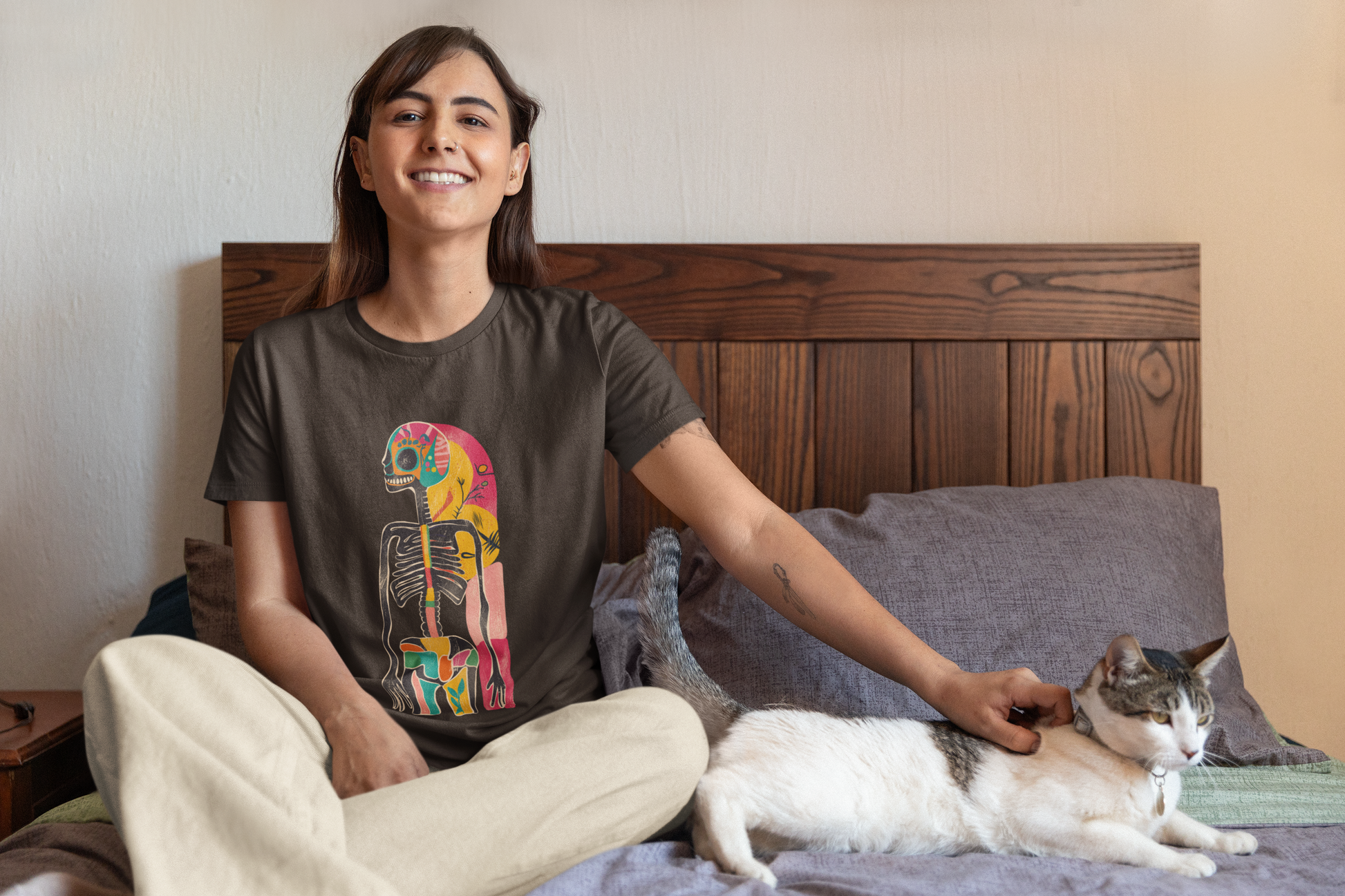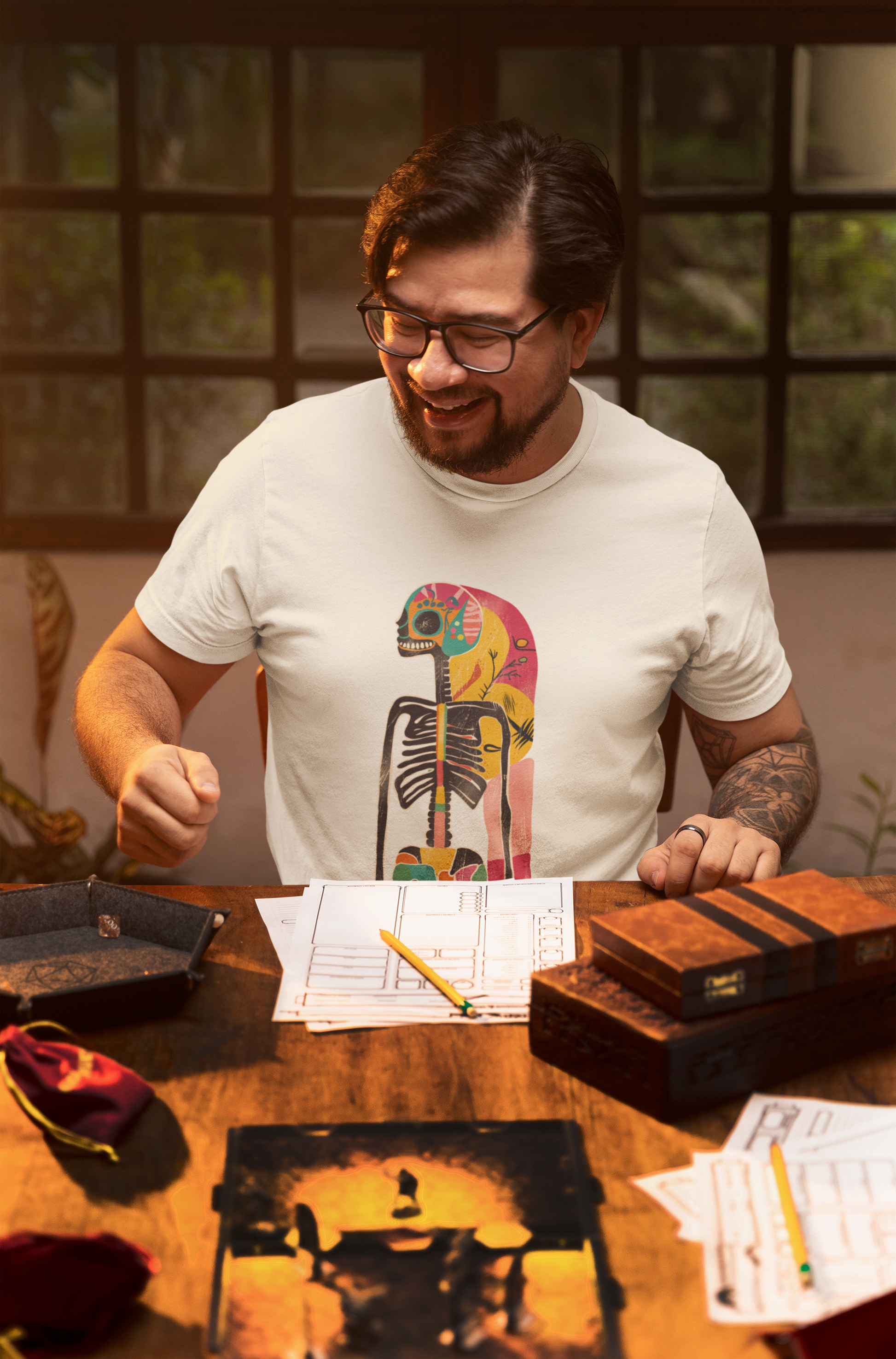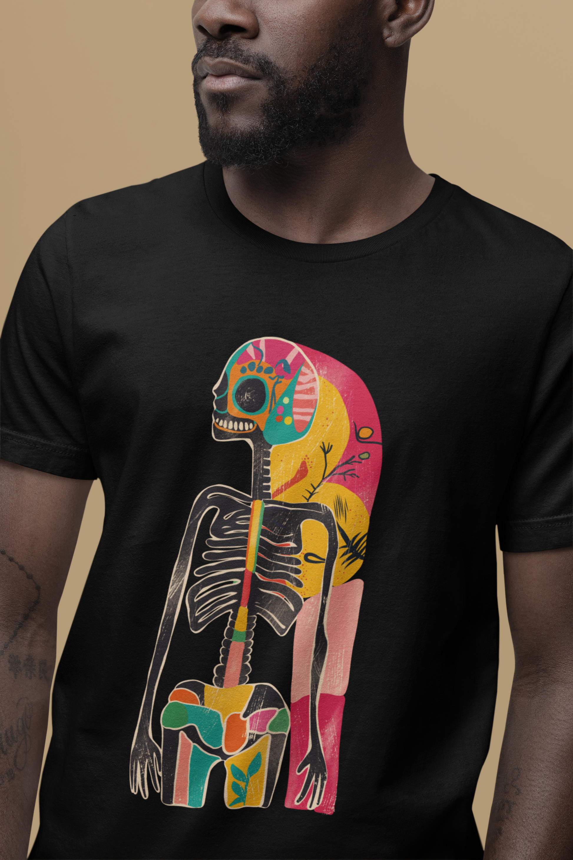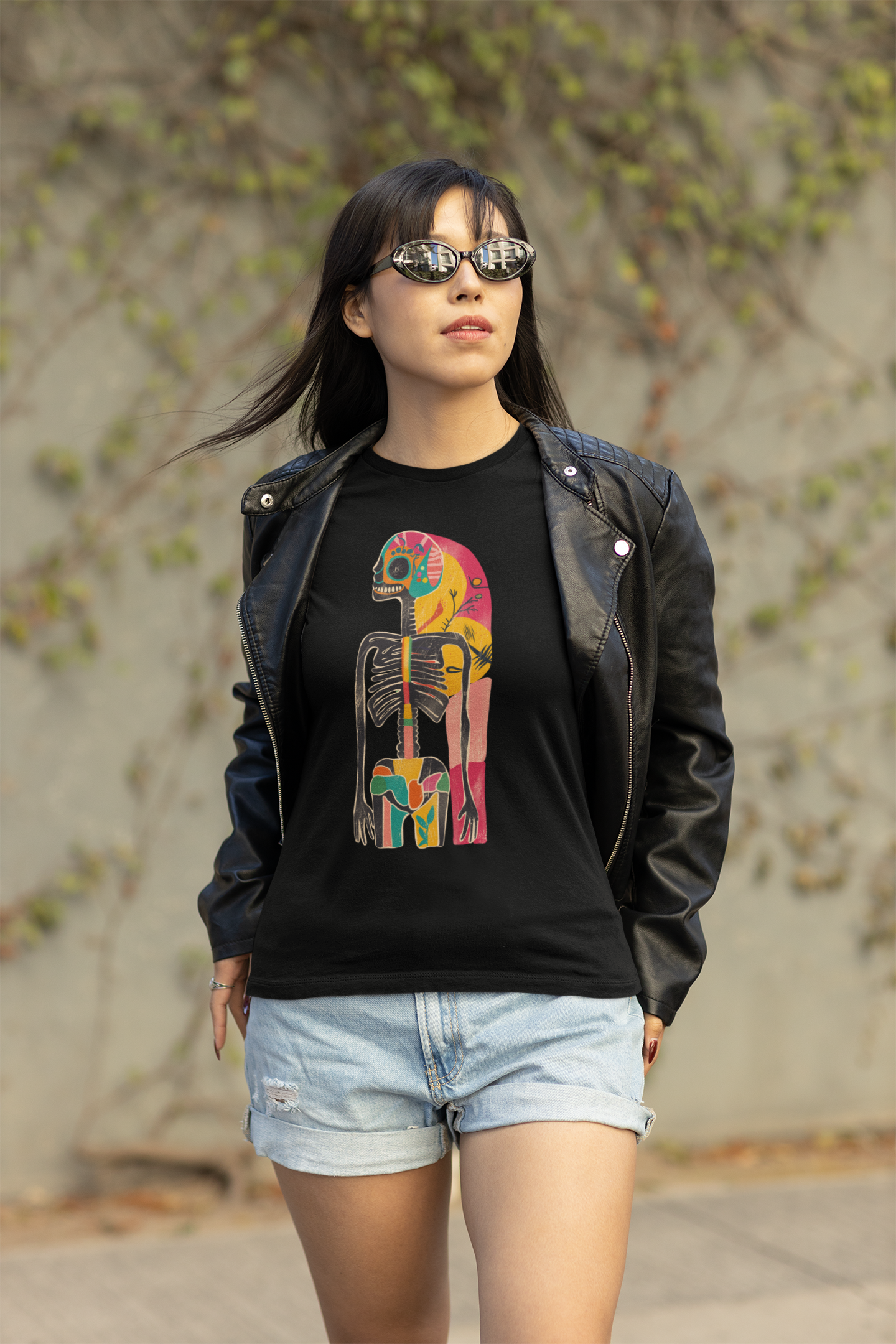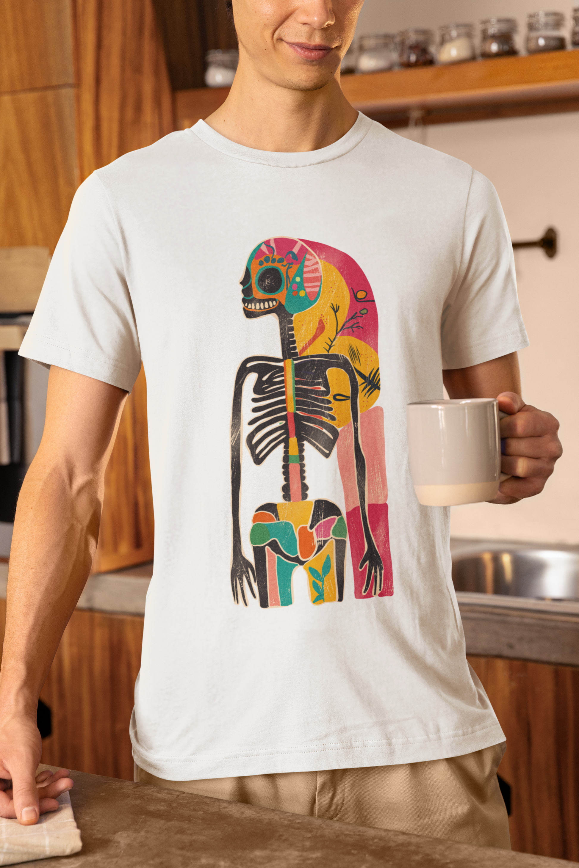 Das Highlight: ein künstlerisches Skelett-Design im Retro-Stil, das kosmische Elemente mit Dark Art und surrealer Ästhetik verbindet. Ausdrucksstark, individuell und garantiert ein Hingucker!