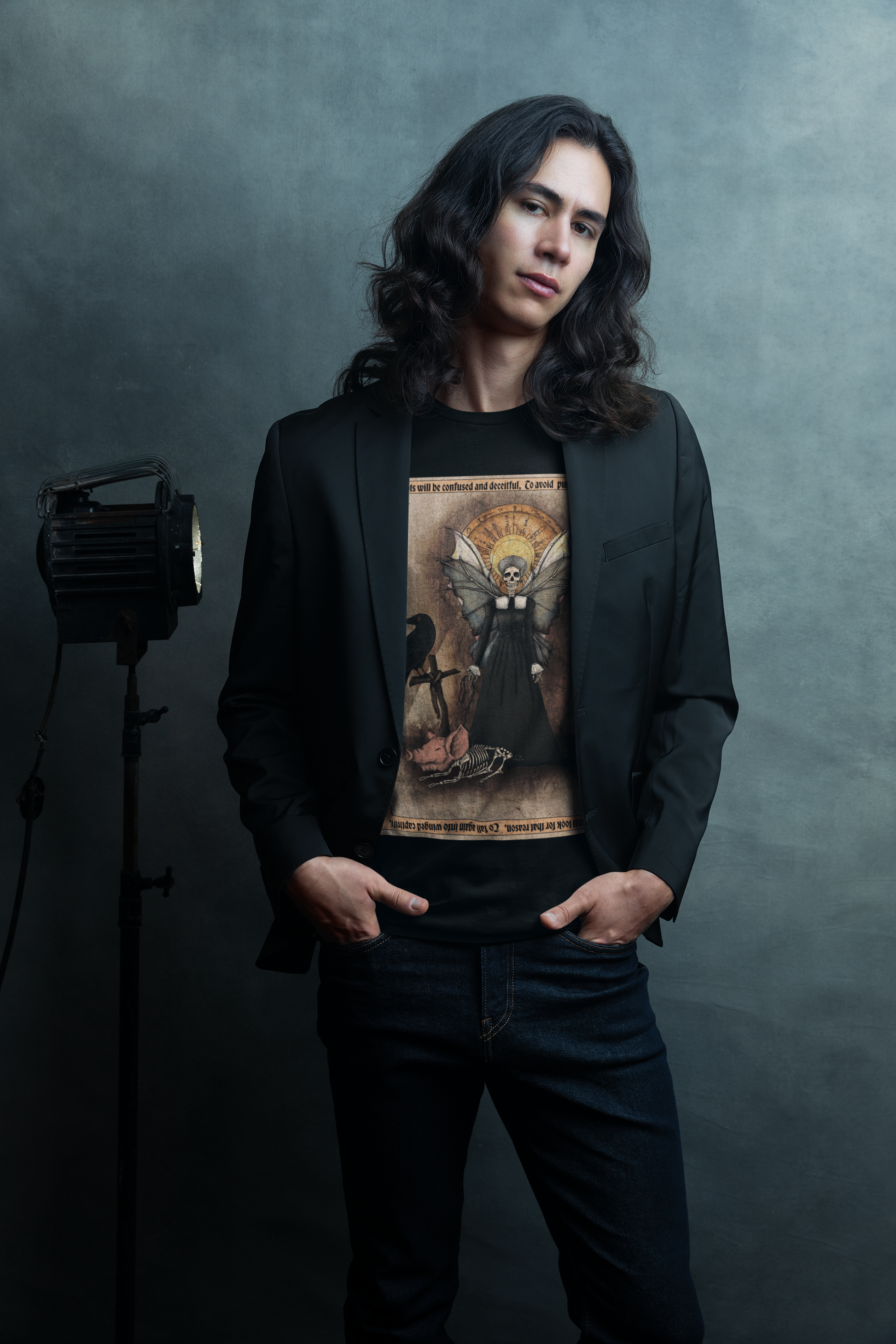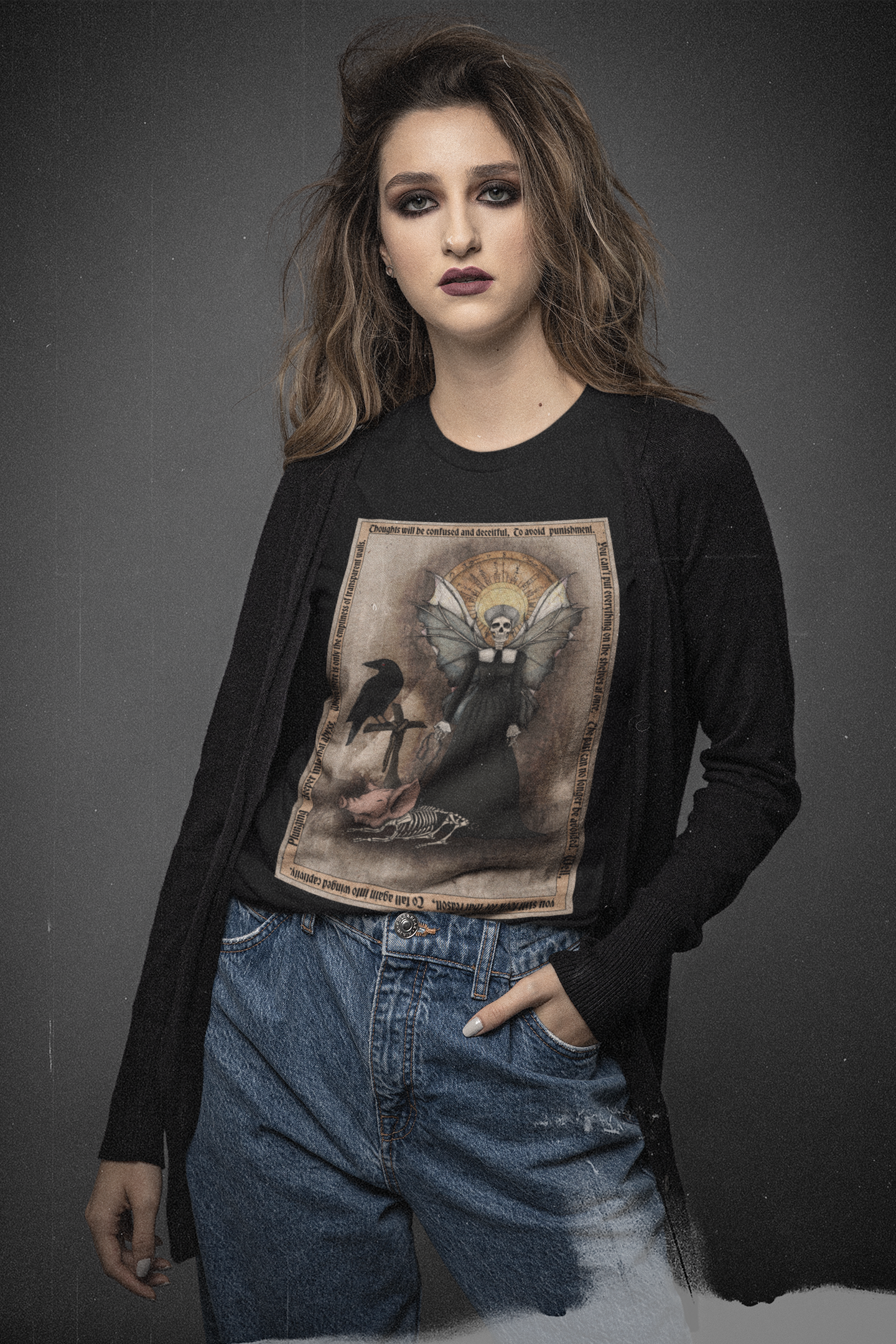 Mit seinem auffälligen Grafik-Print (Engel & Krähe) kombiniert es Streetwear, Grunge und alternative Ästhetik zu einem einzigartigen Look.