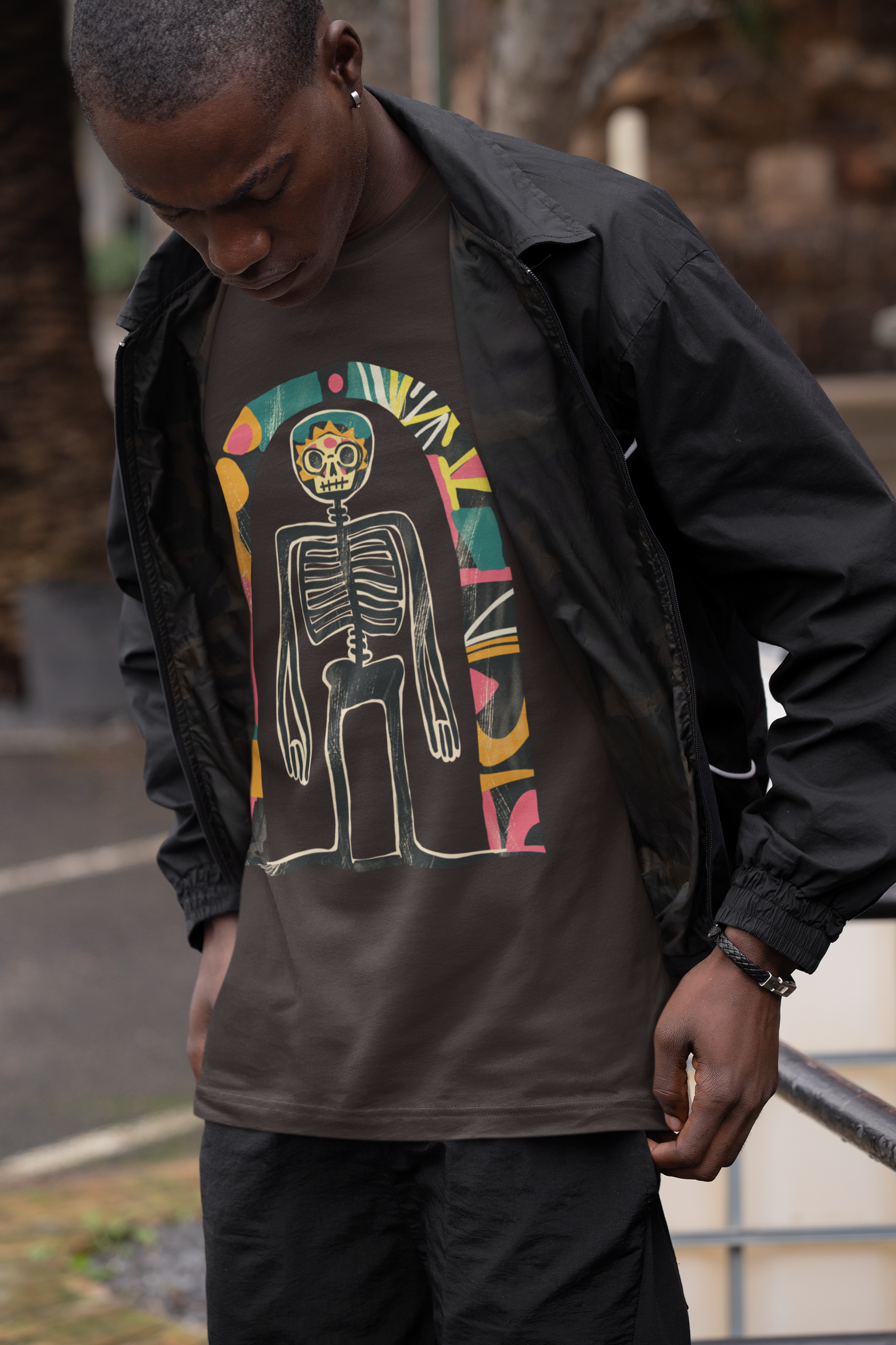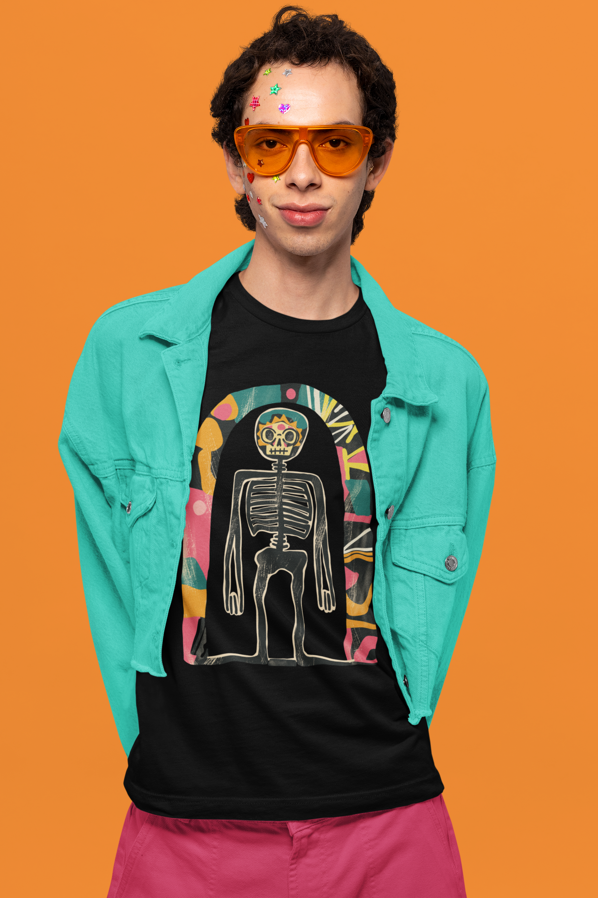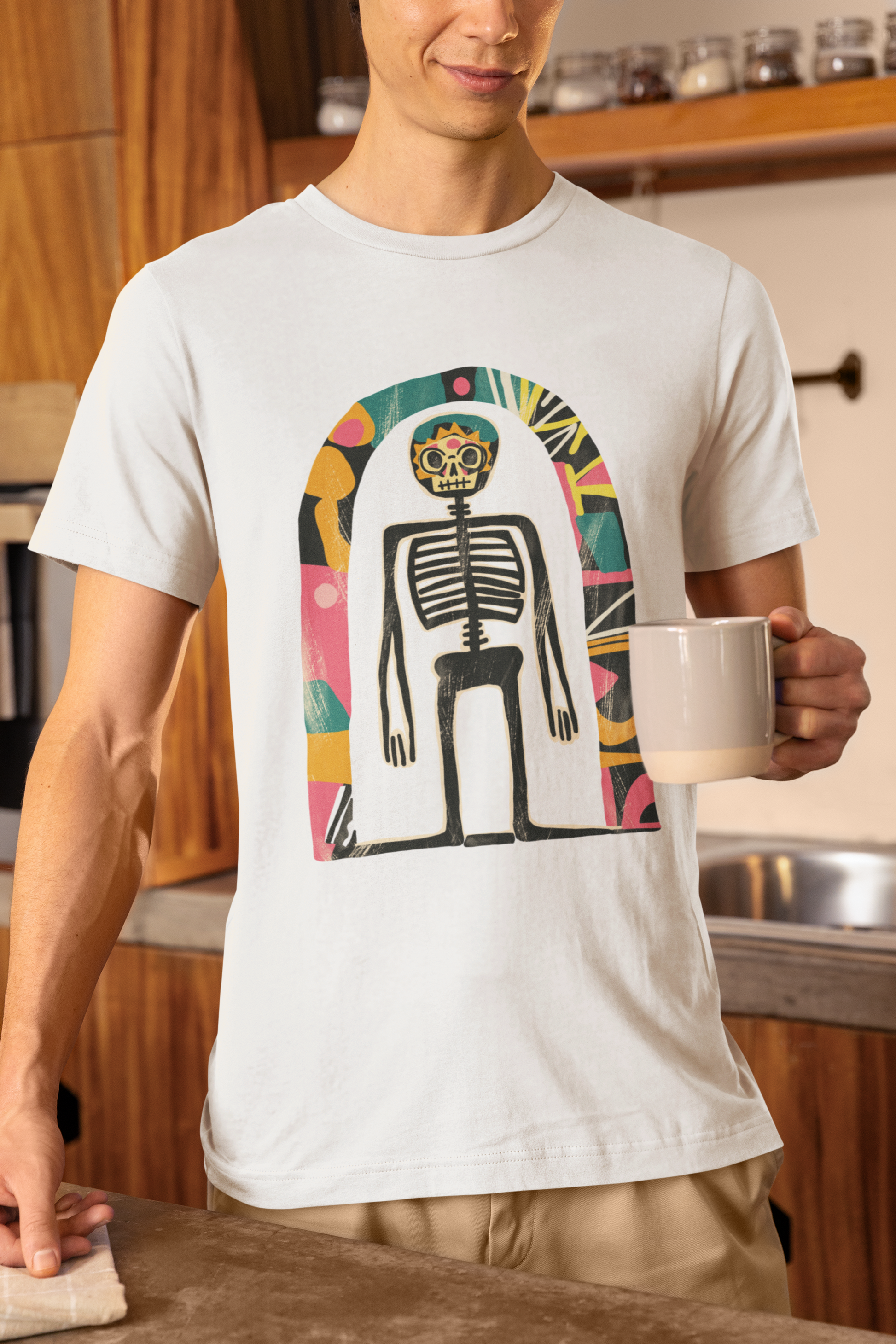 Das Highlight: ein künstlerisches Skelett-Design im Retro-Stil, das kosmische Elemente mit Dark Art und surrealer Ästhetik verbindet. Ausdrucksstark, individuell und garantiert ein Hingucker!