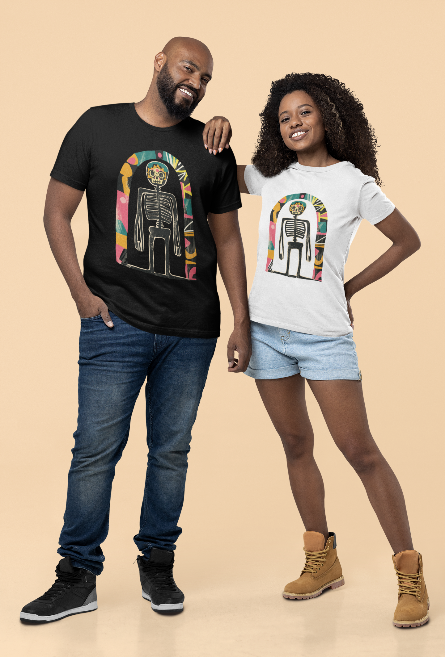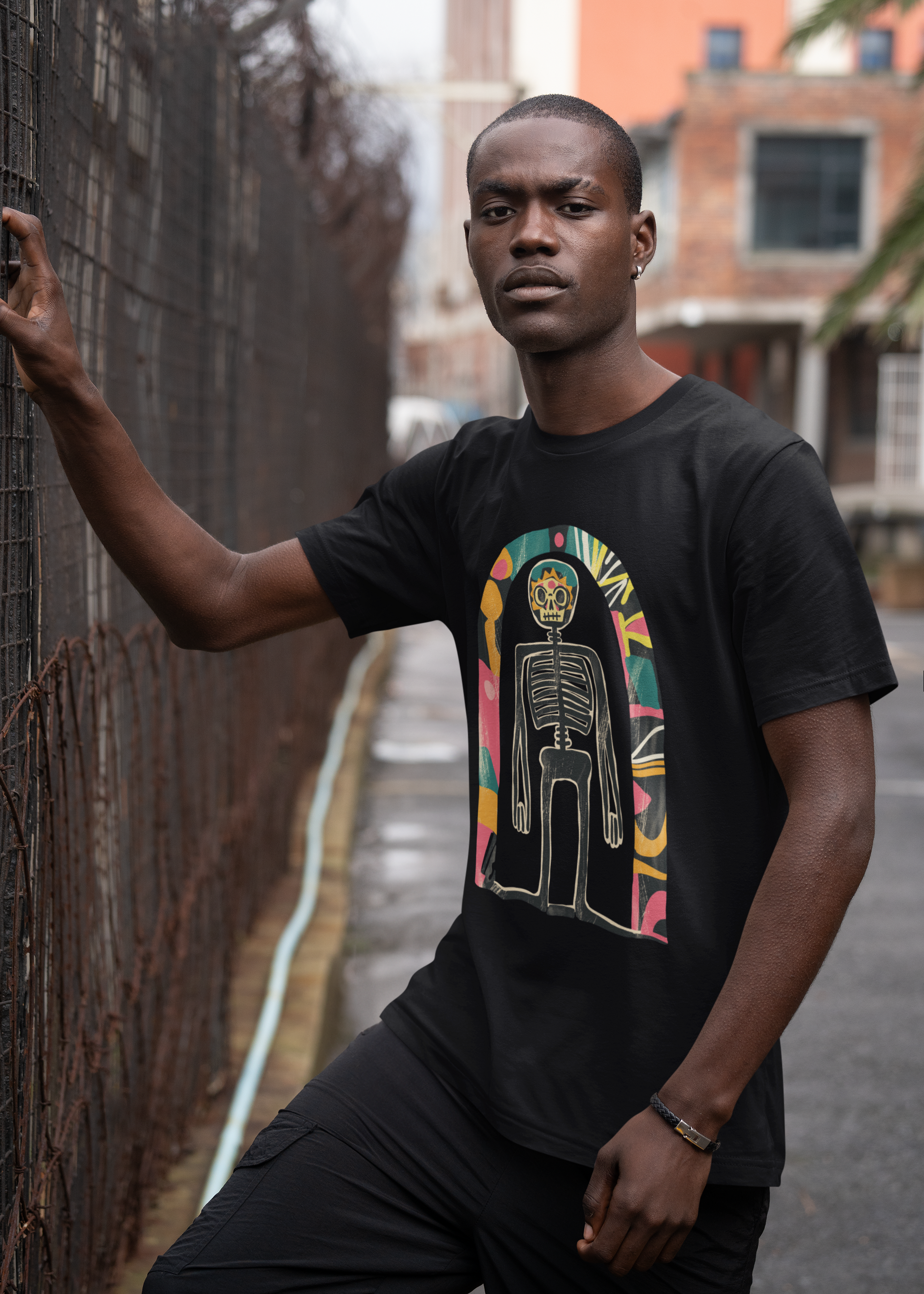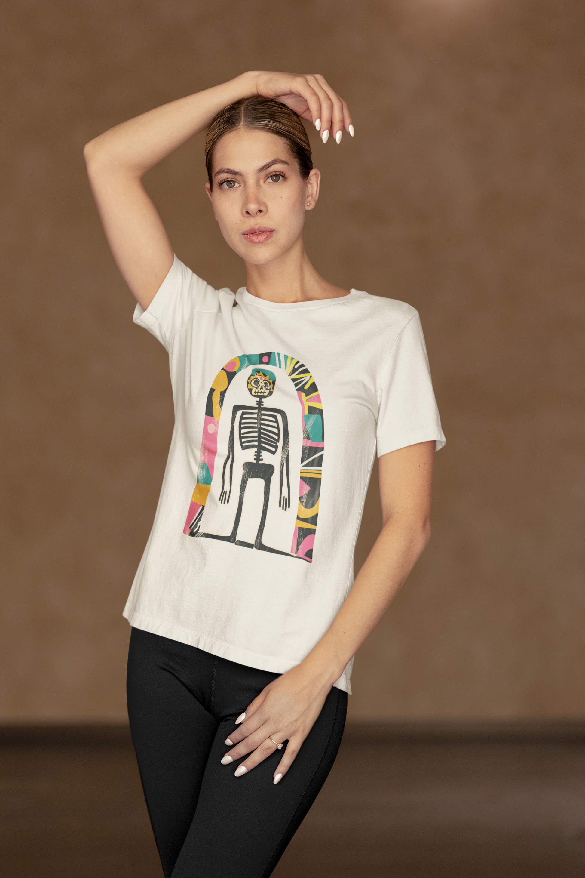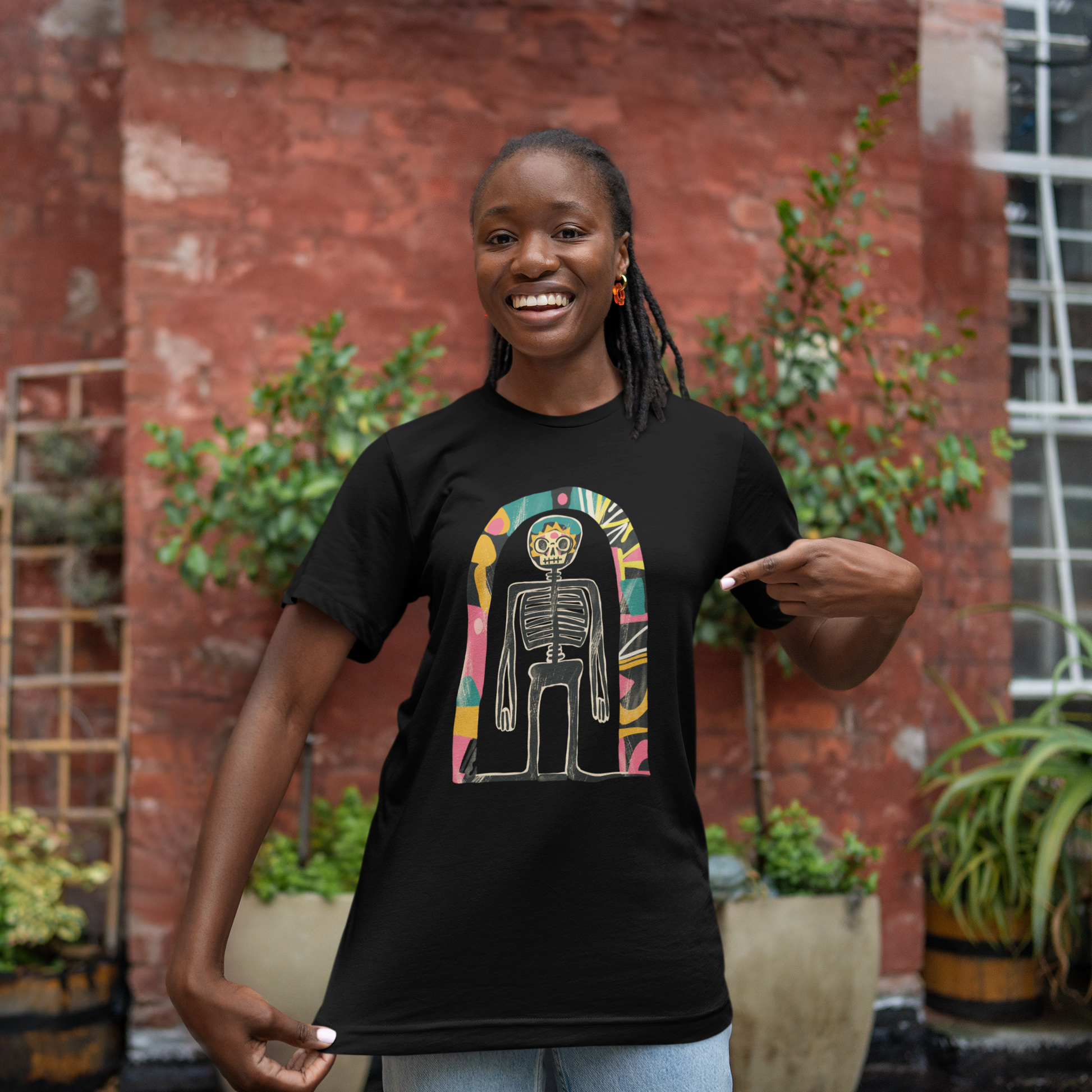 Das Highlight: ein künstlerisches Skelett-Design im Retro-Stil, das kosmische Elemente mit Dark Art und surrealer Ästhetik verbindet. Ausdrucksstark, individuell und garantiert ein Hingucker!