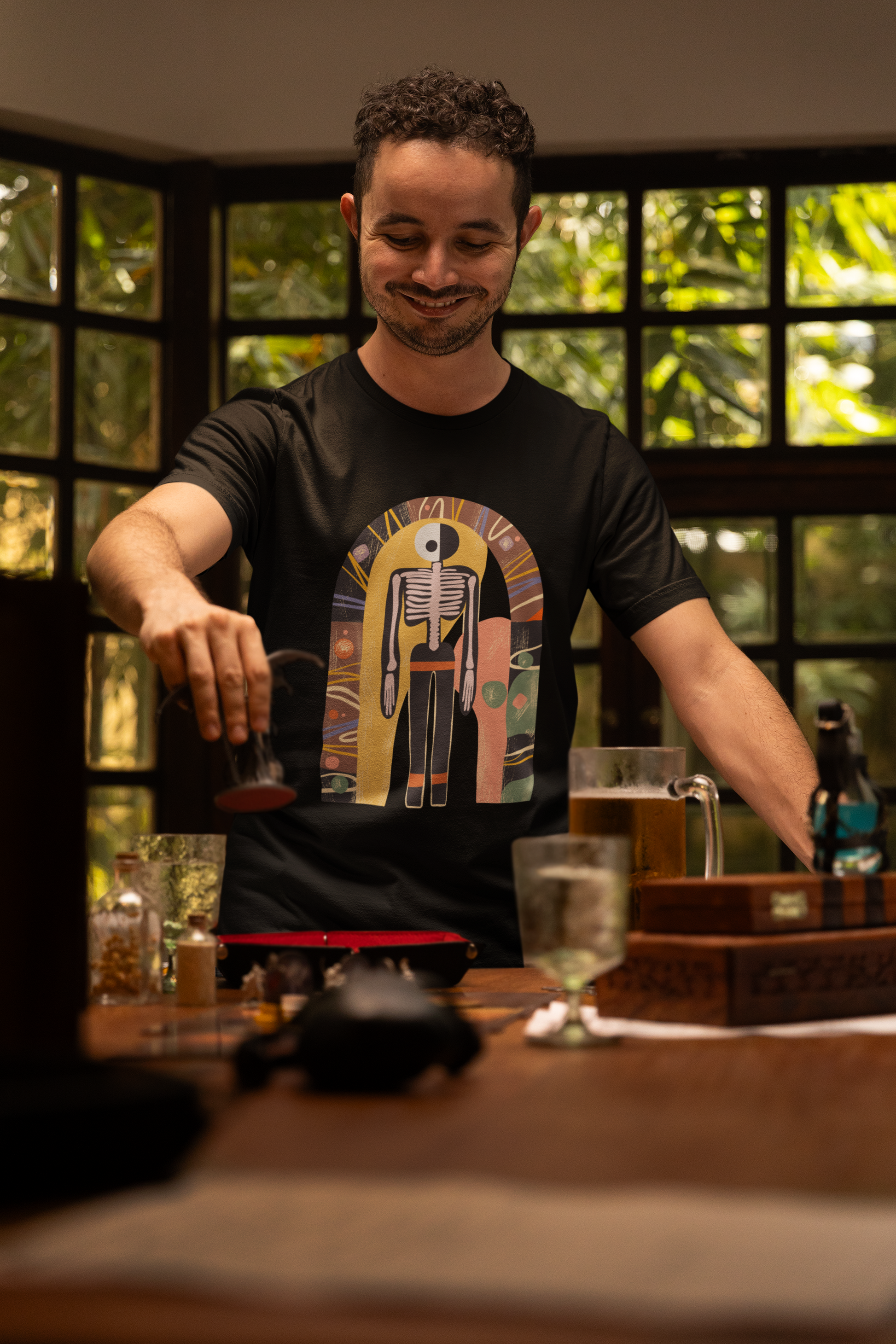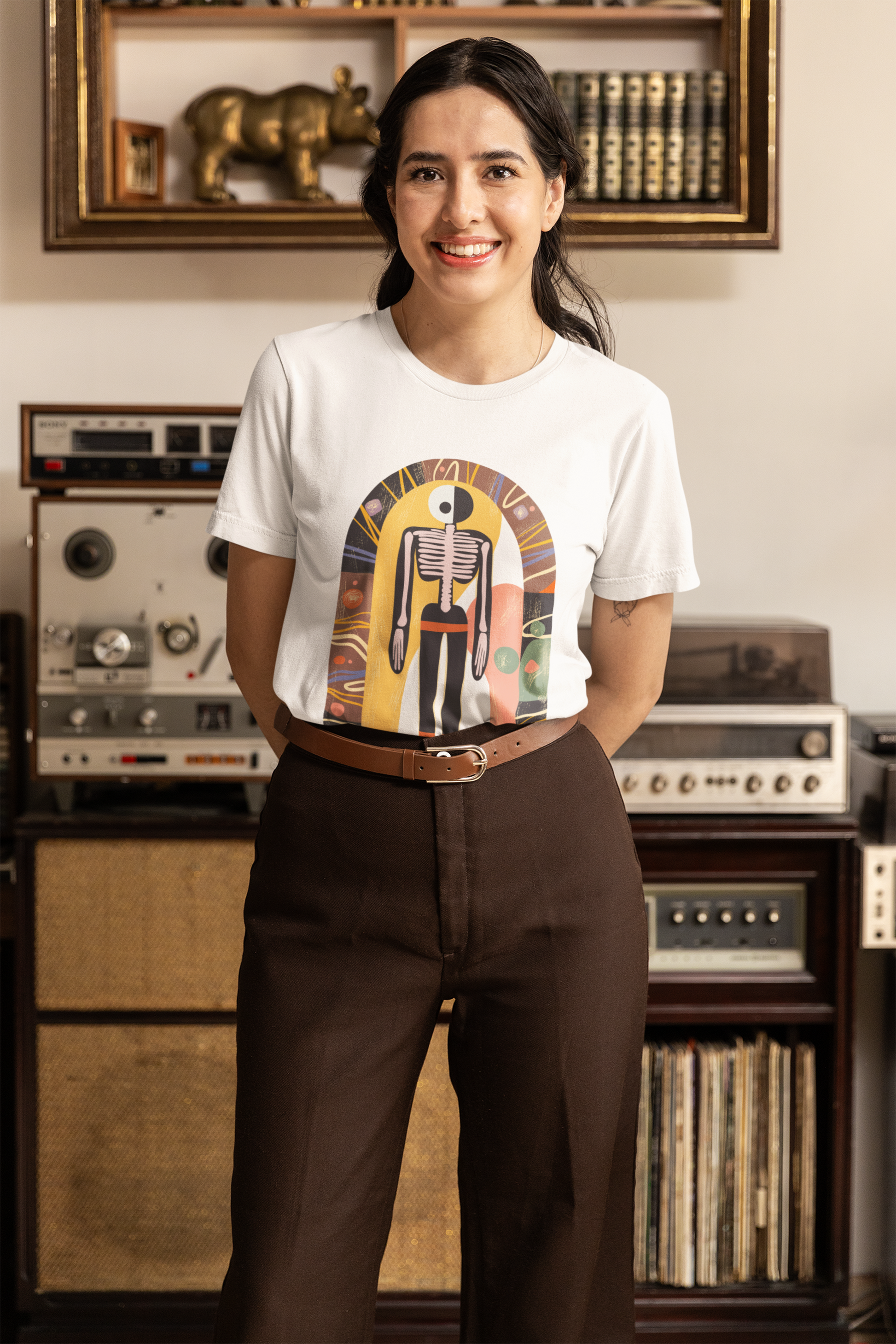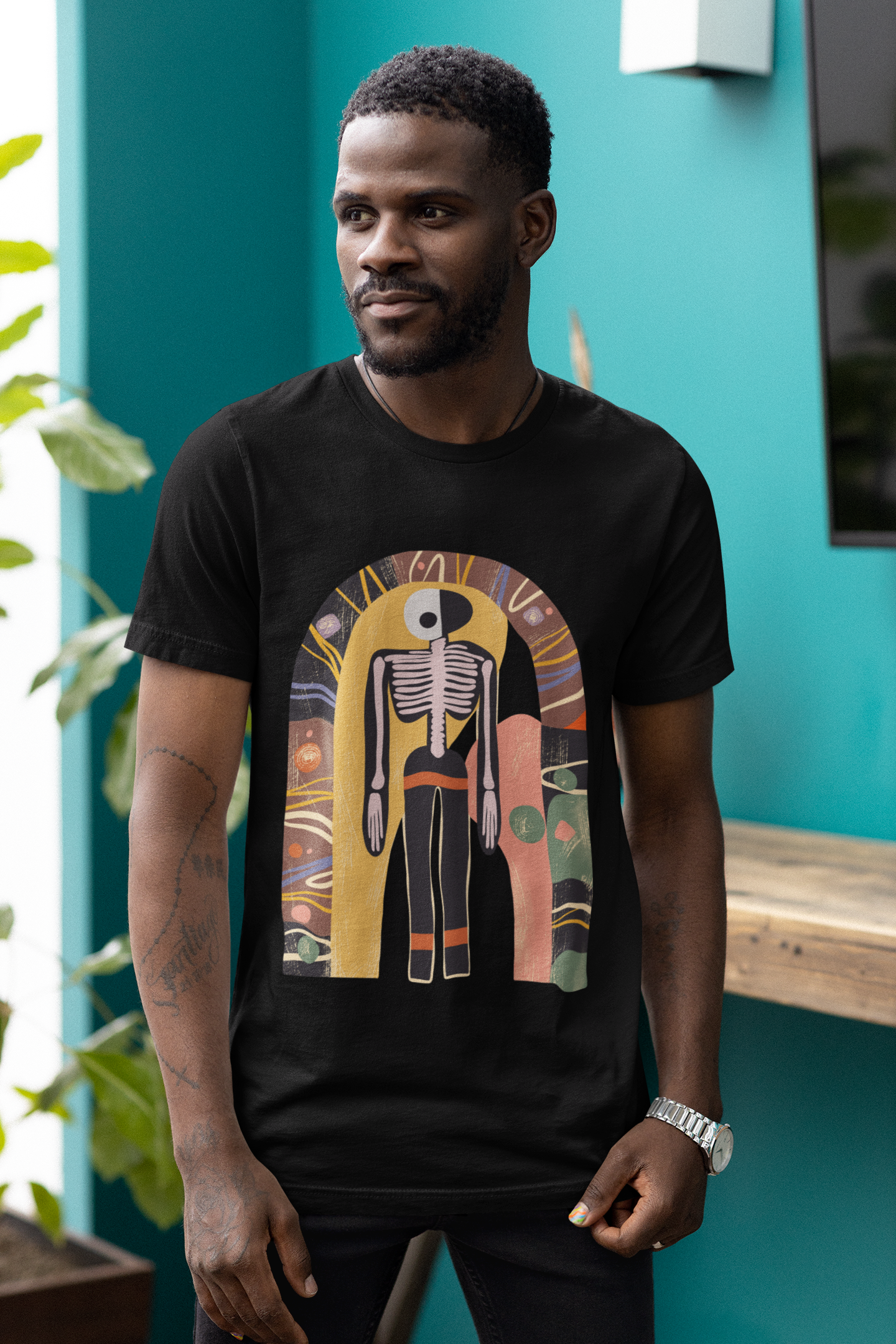 Das Highlight: ein künstlerisches Skelett-Design im Retro-Stil, das kosmische Elemente mit Dark Art und surrealer Ästhetik verbindet. Ausdrucksstark, individuell und garantiert ein Hingucker!