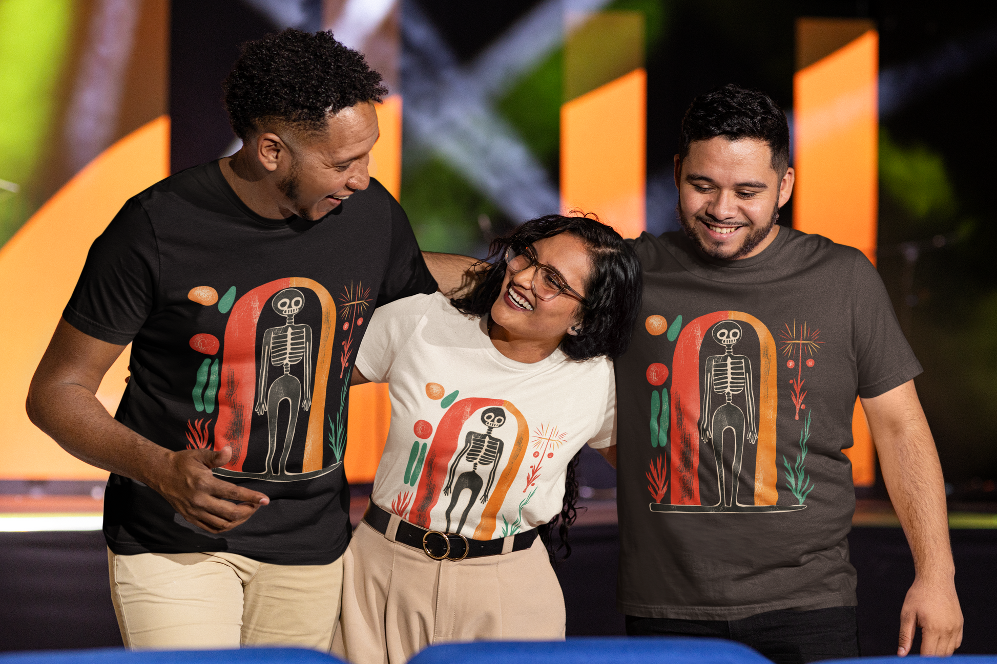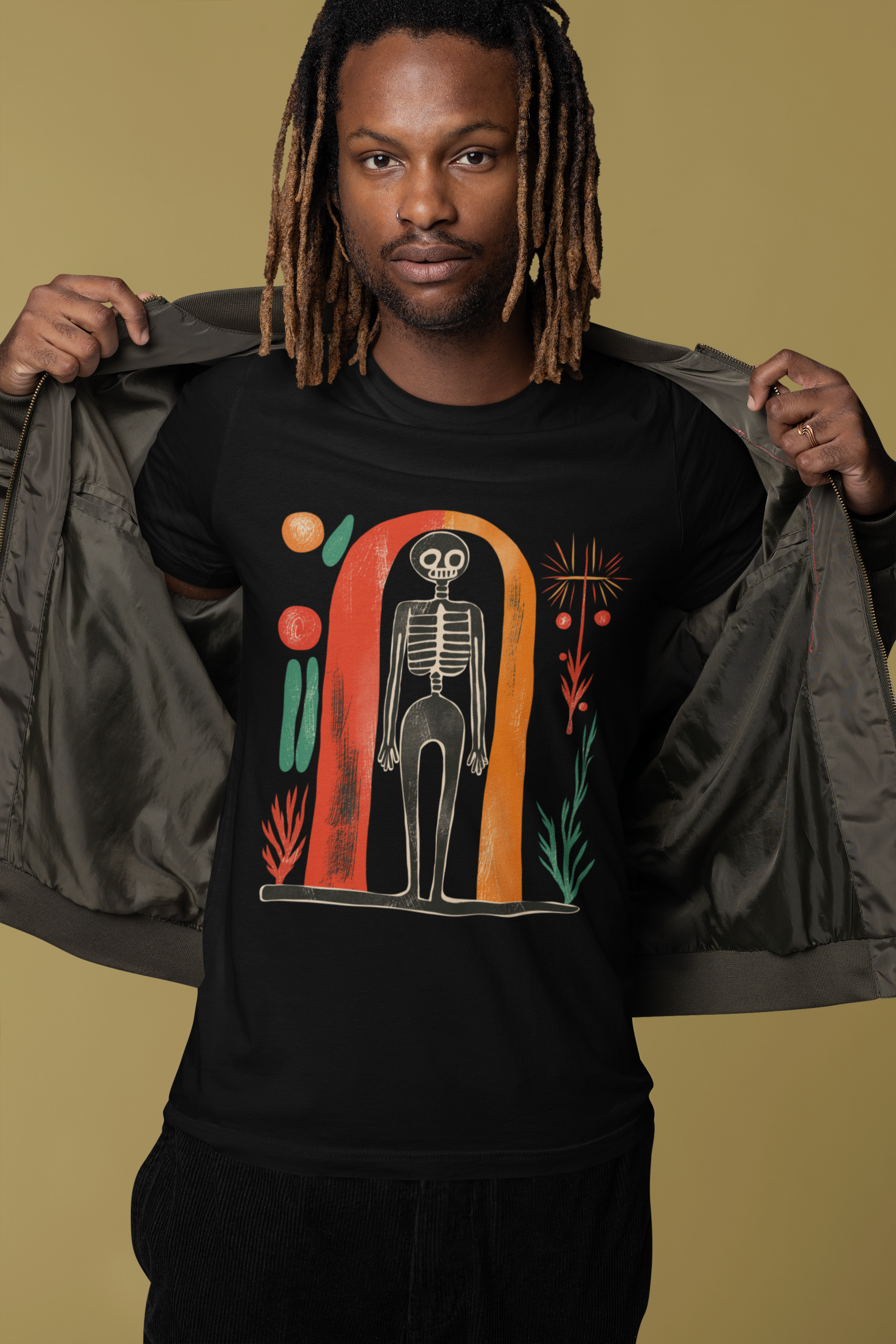 Das Highlight: ein künstlerisches Skelett-Design im Retro-Stil, das kosmische Elemente mit Dark Art und surrealer Ästhetik verbindet. Ausdrucksstark, individuell und garantiert ein Hingucker!