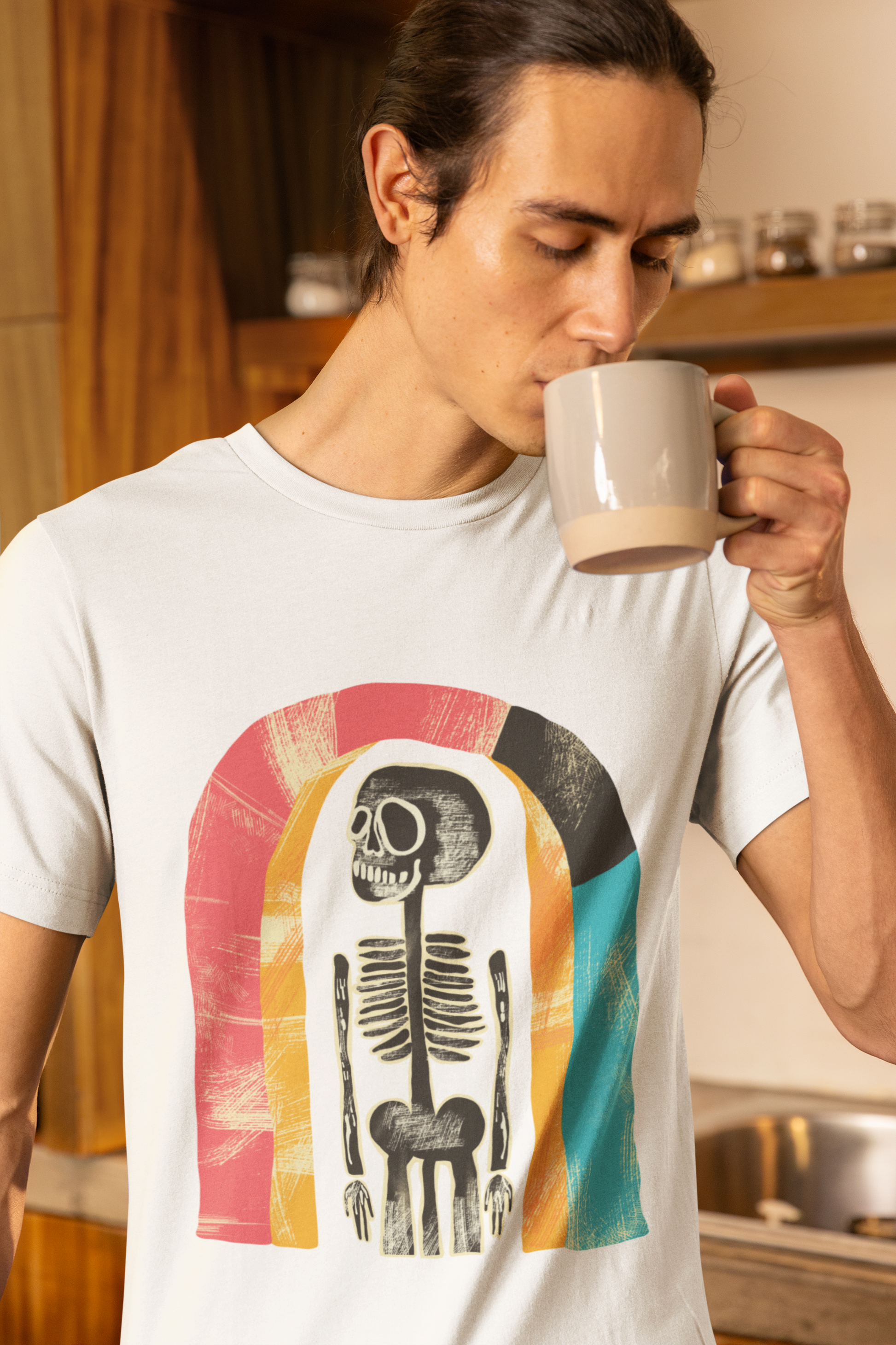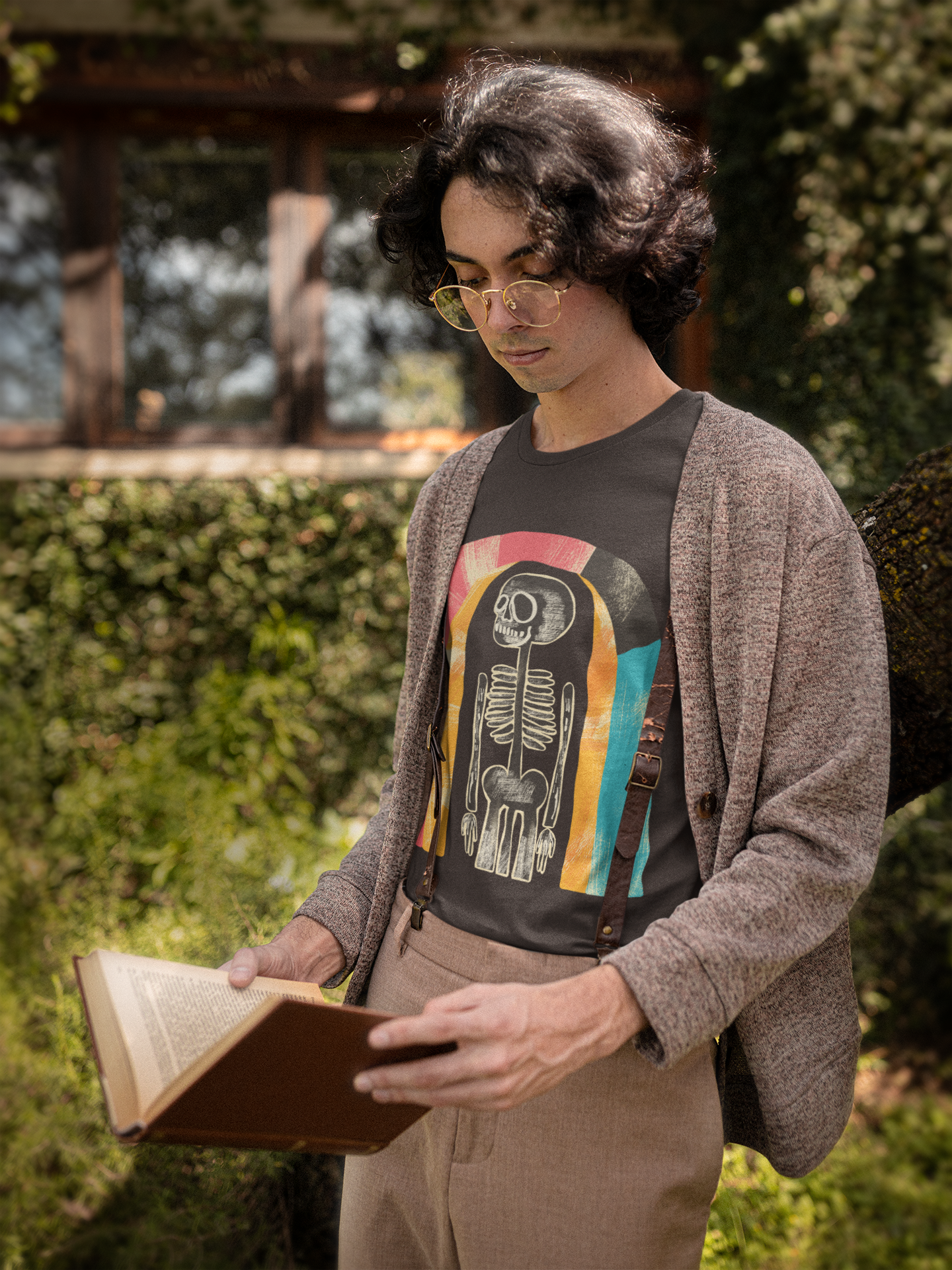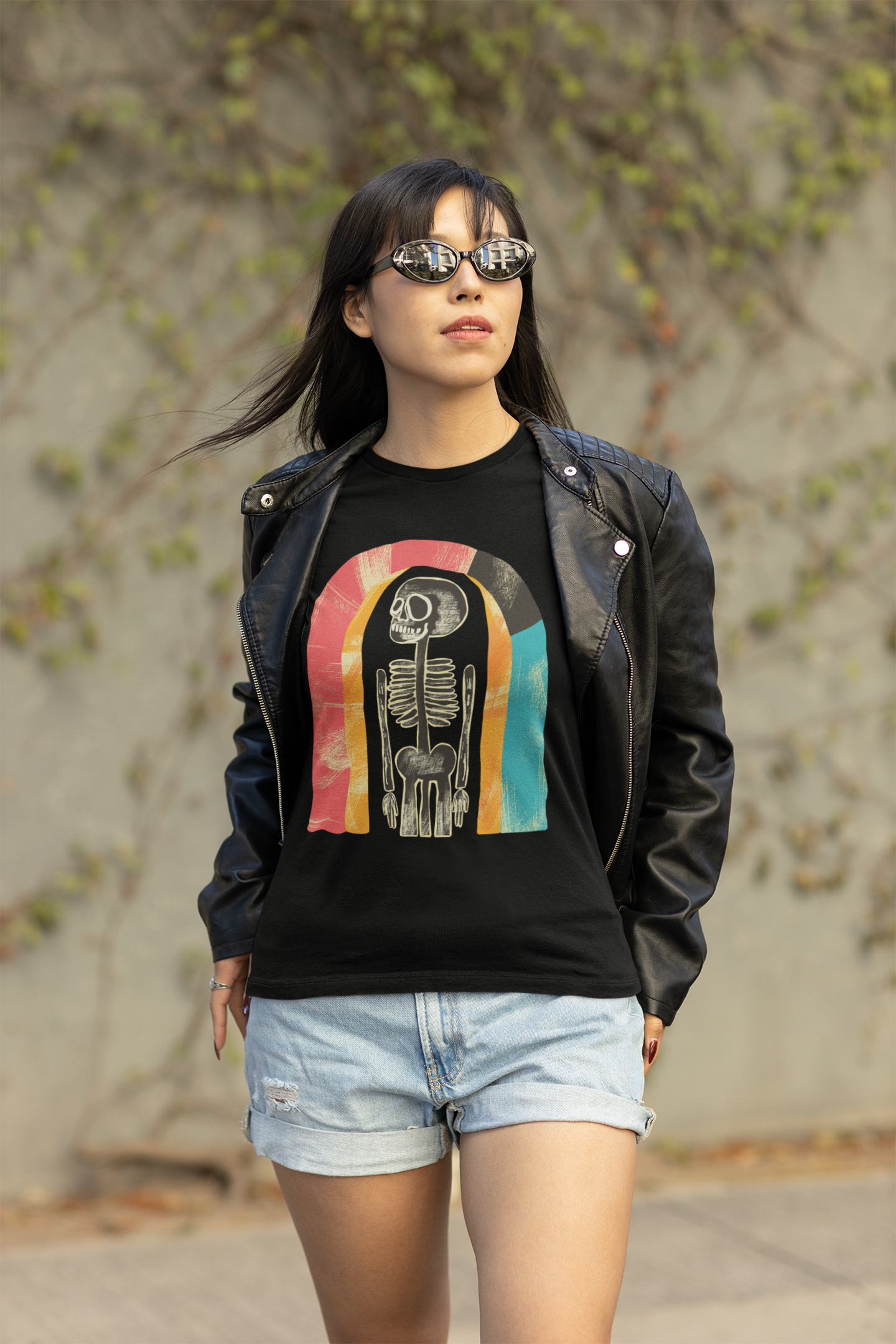 Das Highlight: ein künstlerisches Skelett-Design im Retro-Stil, das kosmische Elemente mit Dark Art und surrealer Ästhetik verbindet. Ausdrucksstark, individuell und garantiert ein Hingucker!