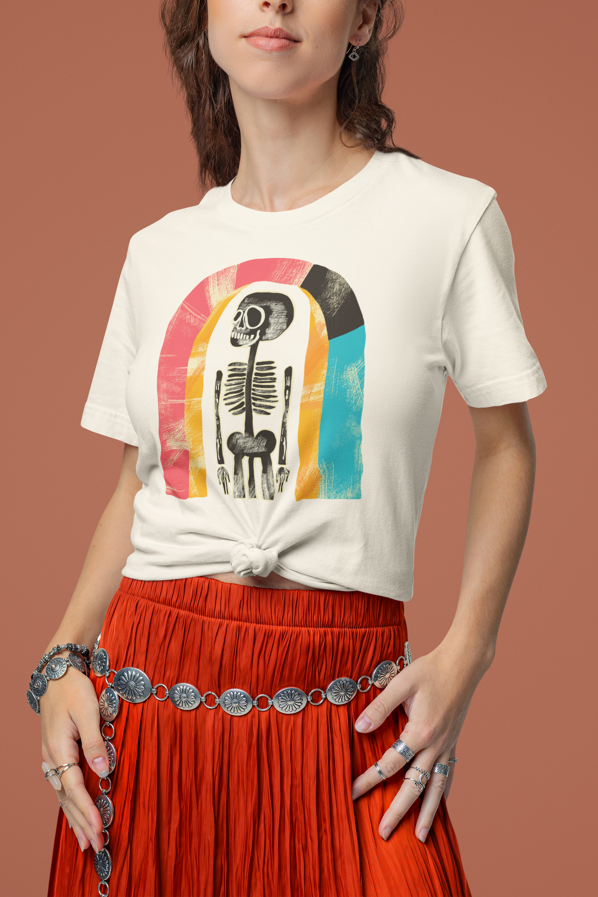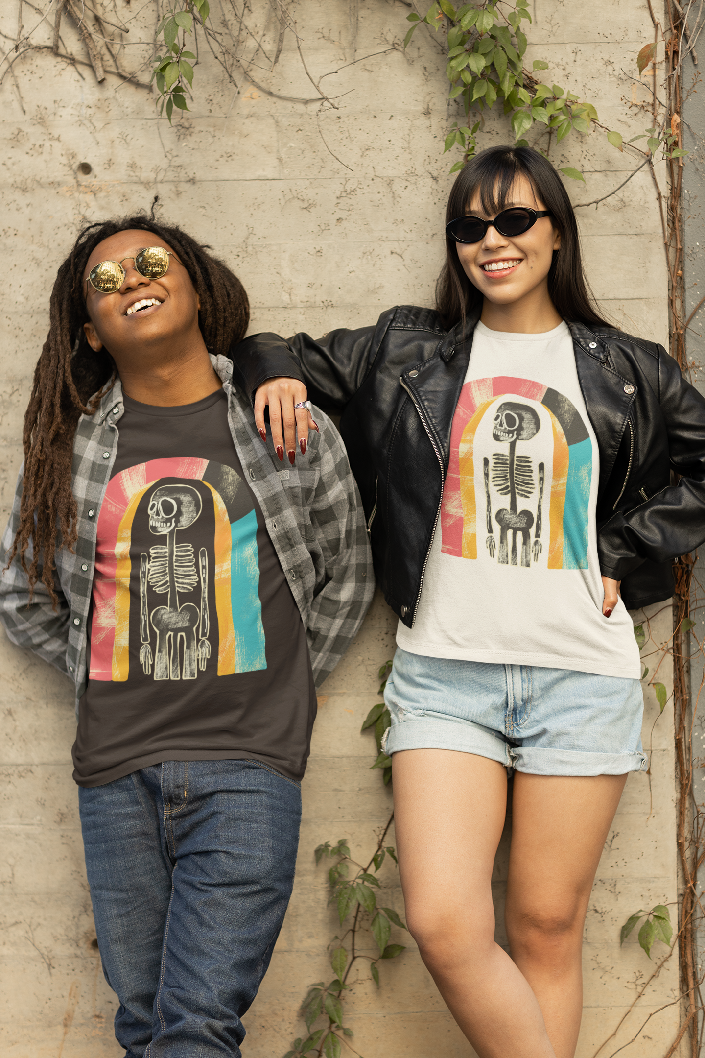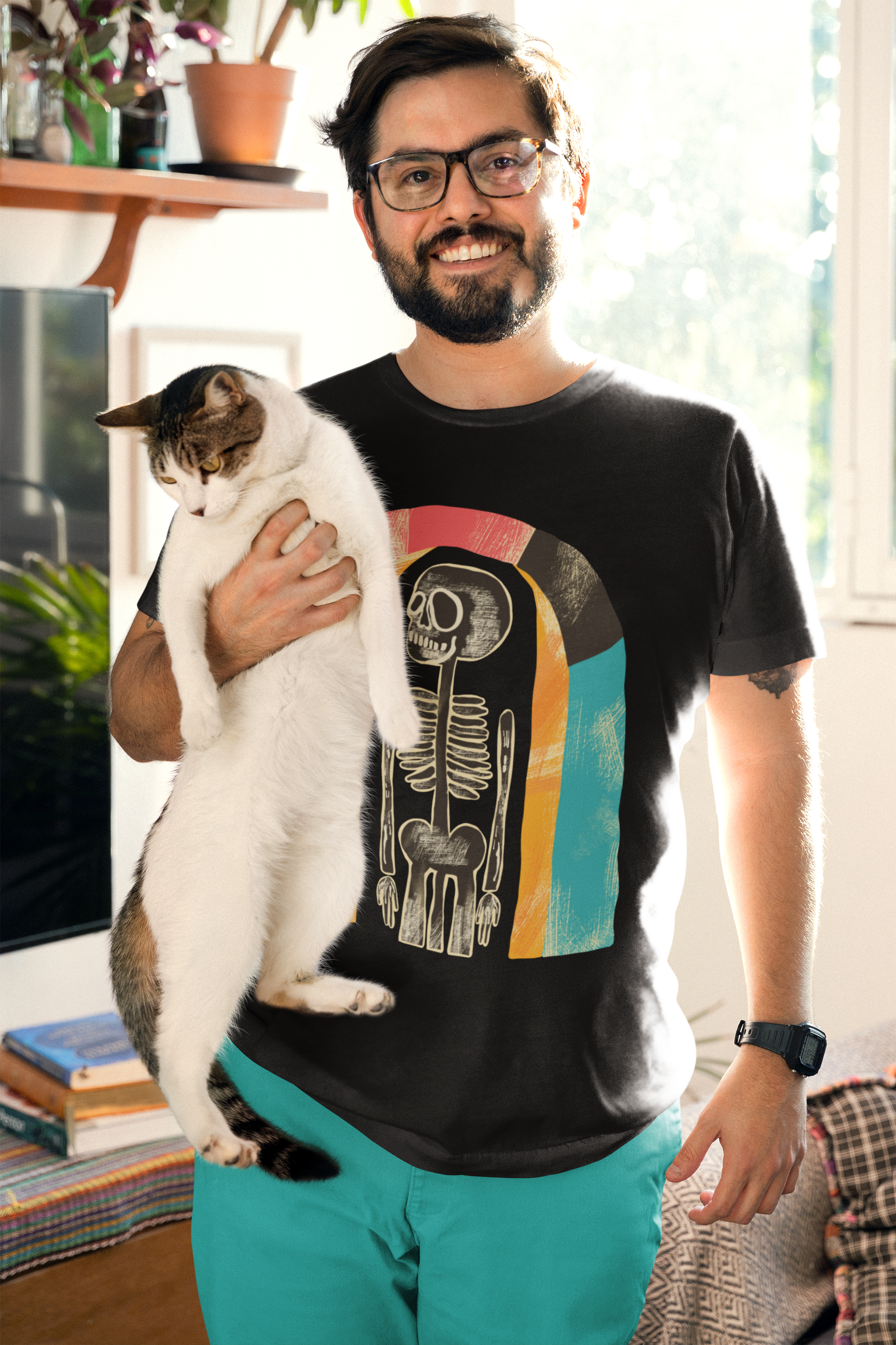 Das Highlight: ein künstlerisches Skelett-Design im Retro-Stil, das kosmische Elemente mit Dark Art und surrealer Ästhetik verbindet. Ausdrucksstark, individuell und garantiert ein Hingucker!